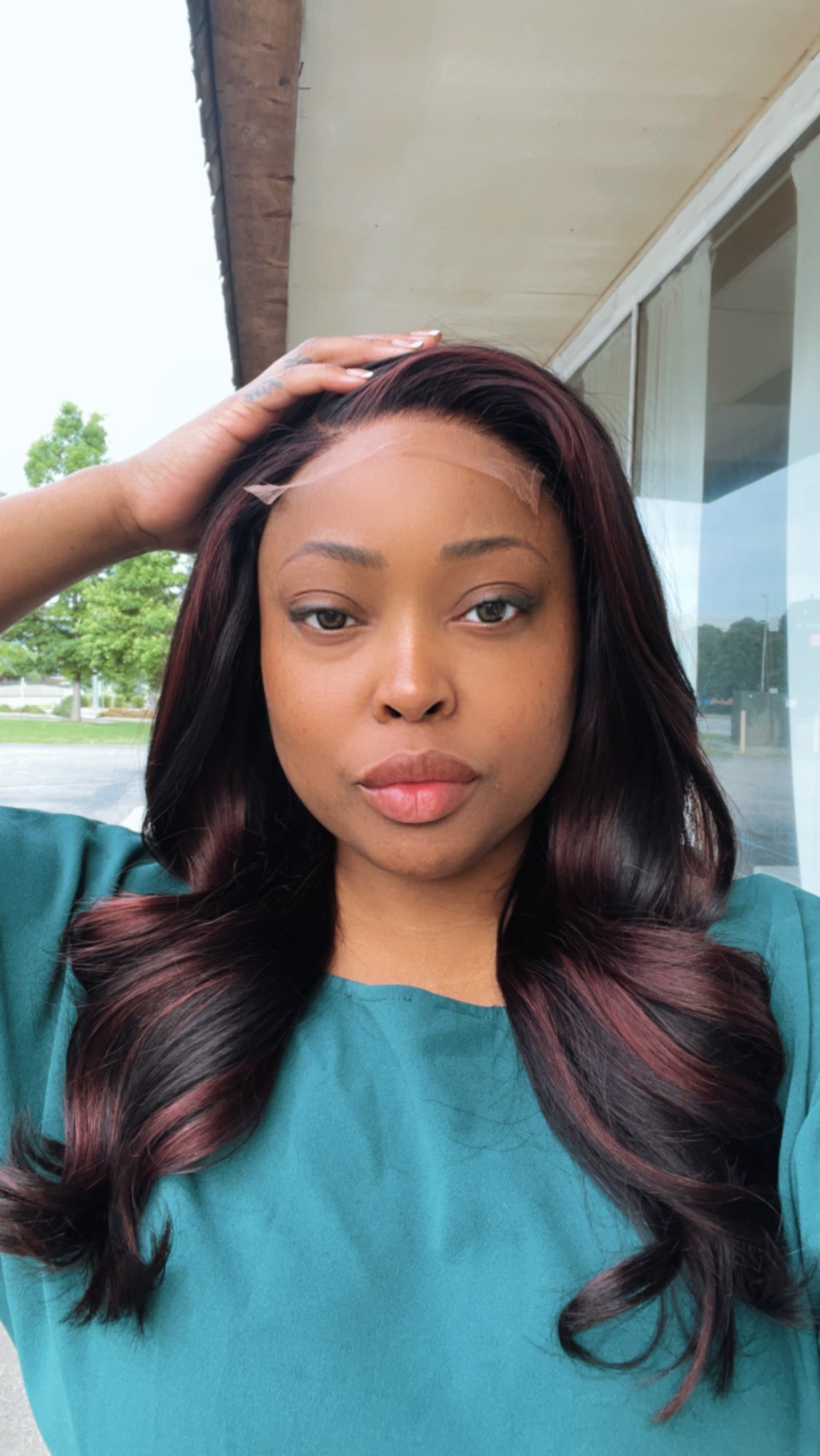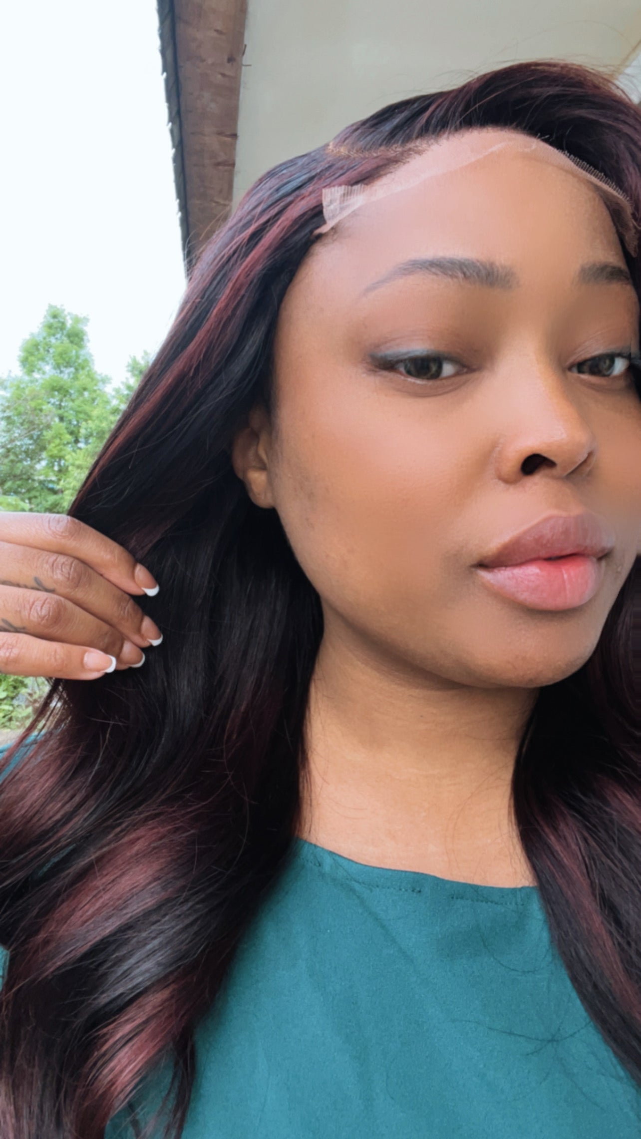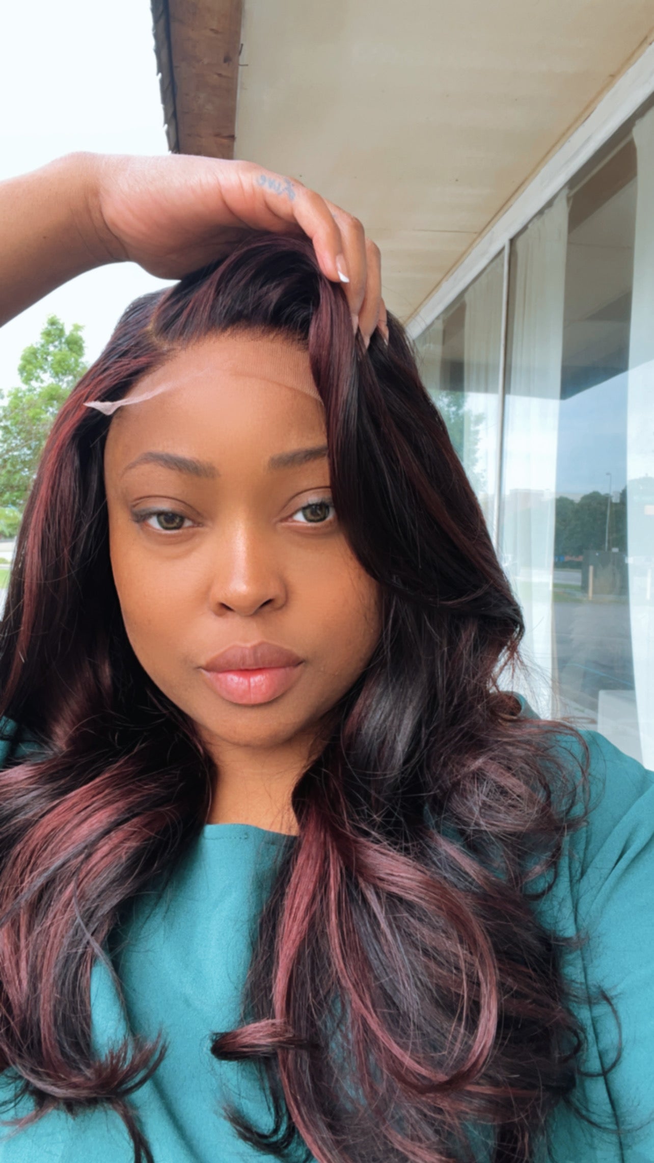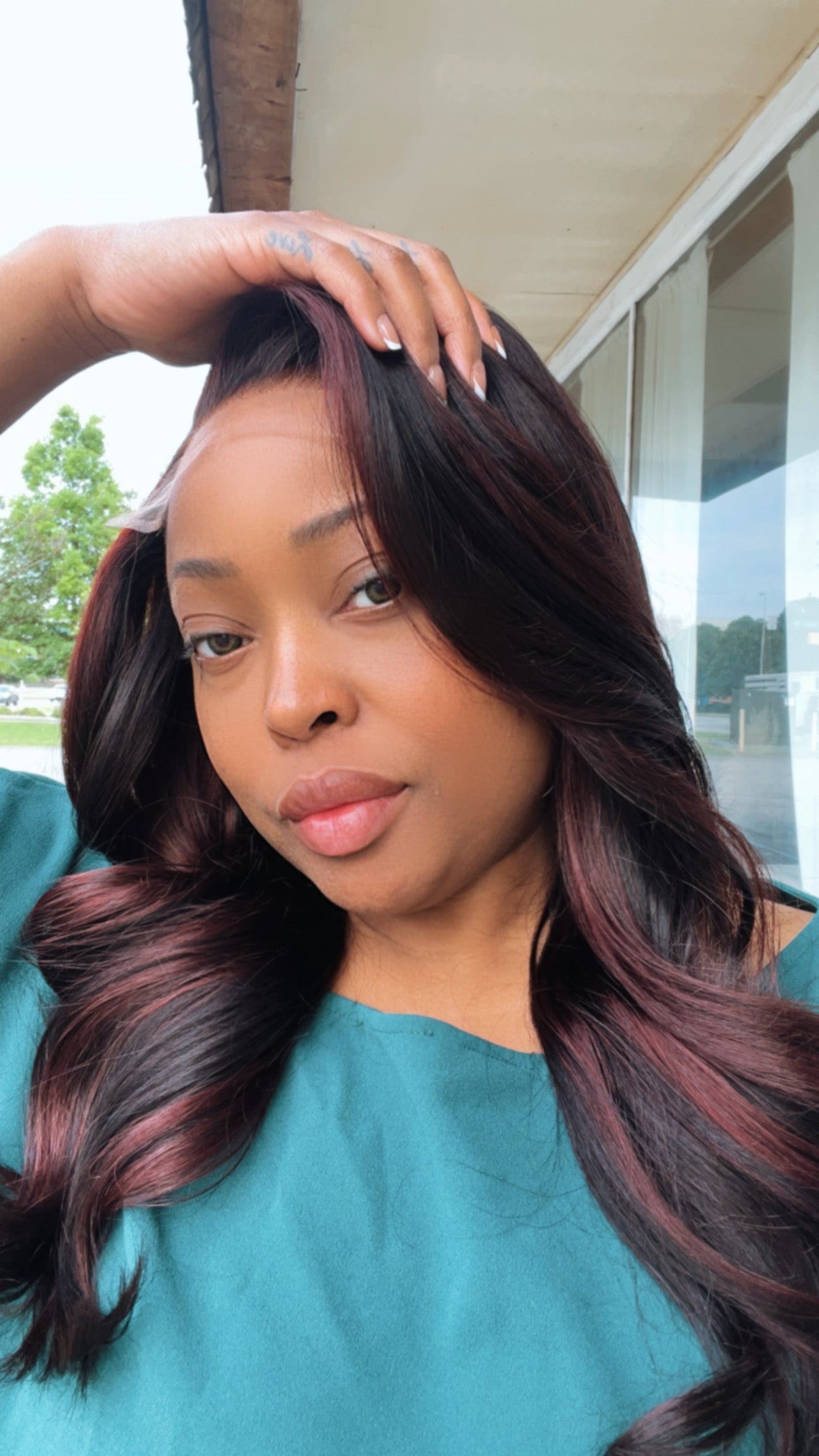 • Color: As shown in photo | Natural Black roots with medium red violet and brown highlights with long sensual layers